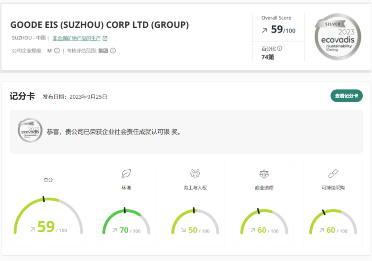 For nylig har Goode EIS (Suzhou) Corp LTD. (Goode Electrical Materials) opnåede 59 point i 2023 Ecovadis bæredygtighedscertificering og vandt sølvmedaljen, rangerende 26 % af de 85.000 virksomheder, der deltager i den globale vurdering, og top 8 % i Kina.
